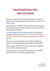 The dates Michell will be on Settlement with the Addictions Counsellor Bobbie will be February 12th, 19th and 26th. Members will be able to continue their regular scheduled appointments.